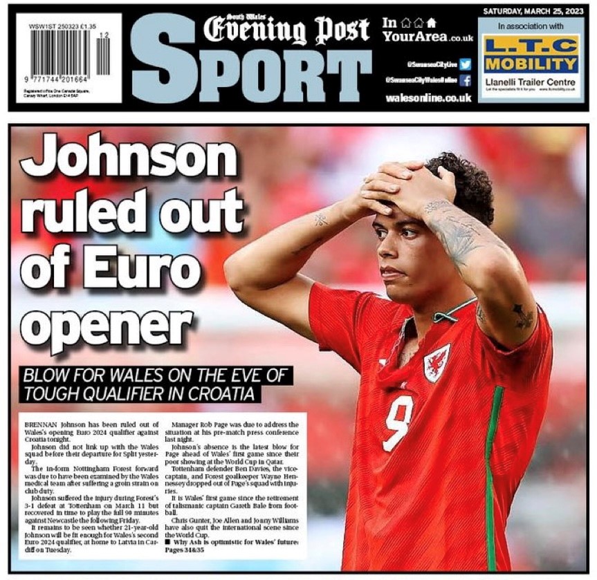Brennan Johnson makes the headlines across Wales this morning ahead of the opening EURO 2024 qualifier against Croatia as injury rules the in-form Nottingham Forest star out of the match. Manager Rob Page expressed his frustration at the situation in his press conference in Split last night, but his focus will now quickly switch to the players he has available for the challenge of taking on the World Cup semi-finalists this evening.